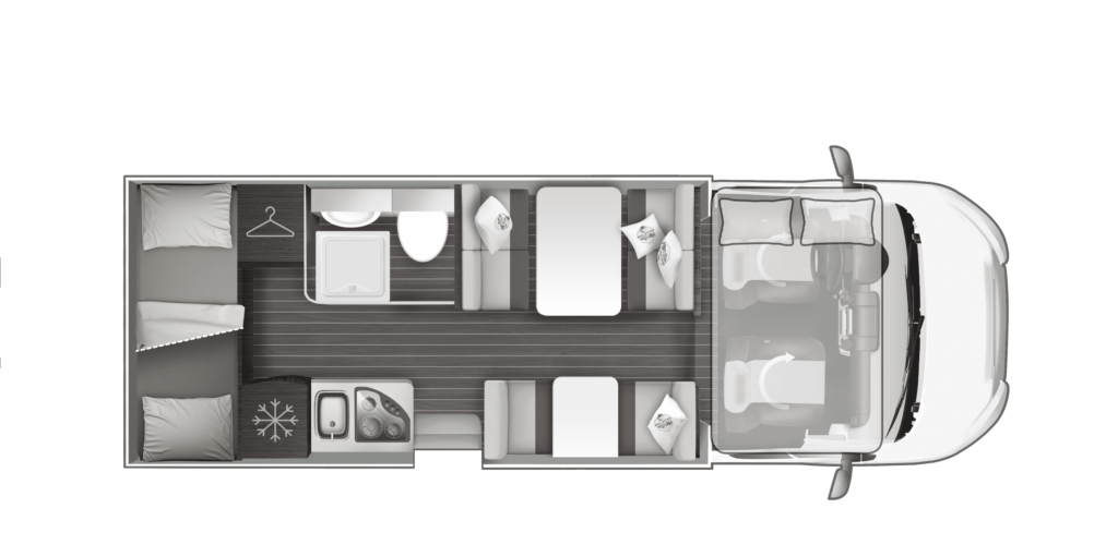 DISTRIBUCIÓN: CAMAS LITERAS TRASERAS Y CAMA SOBRE CABINA