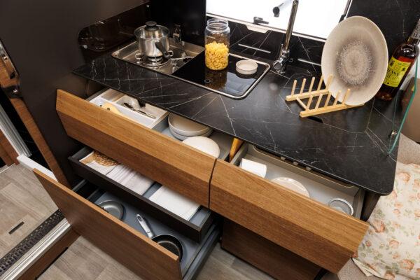 - Cocina con embellecedor ventana, extractor, gran cacerolero, cajón lateral, grifo extensible y especiero iluminado