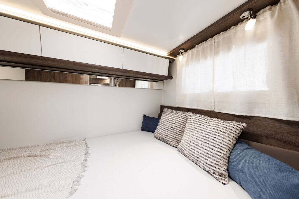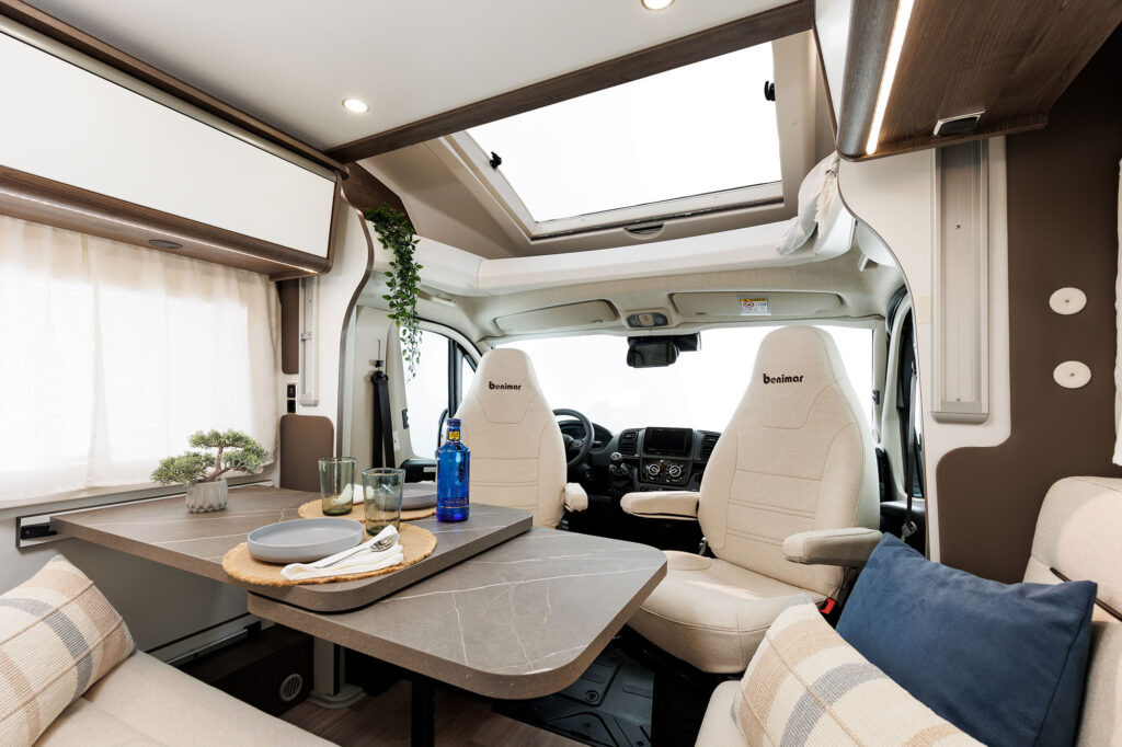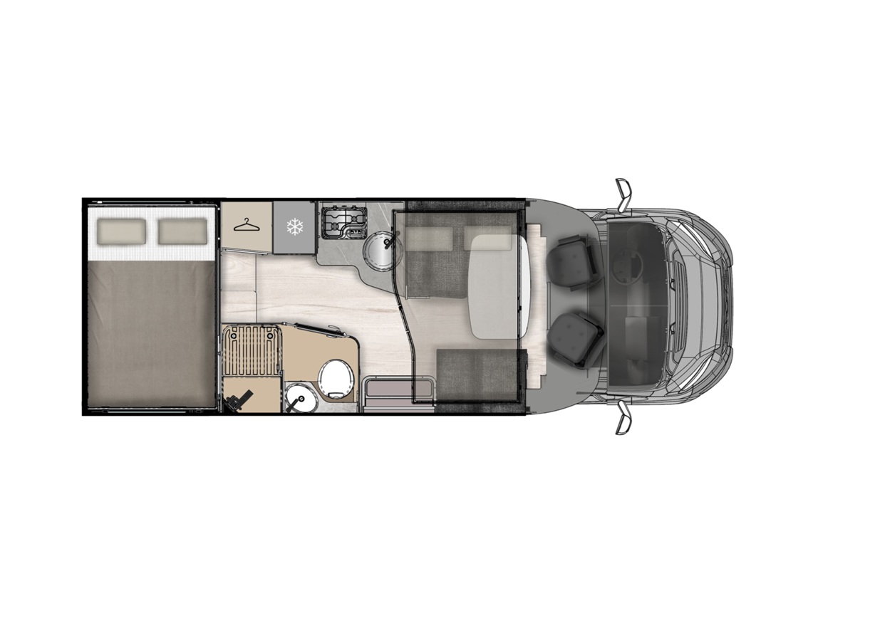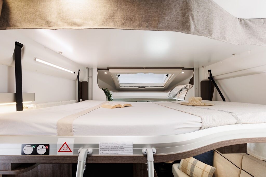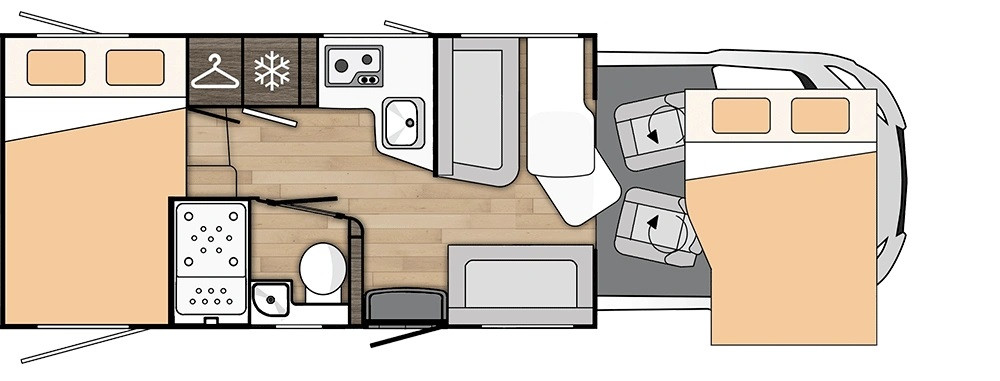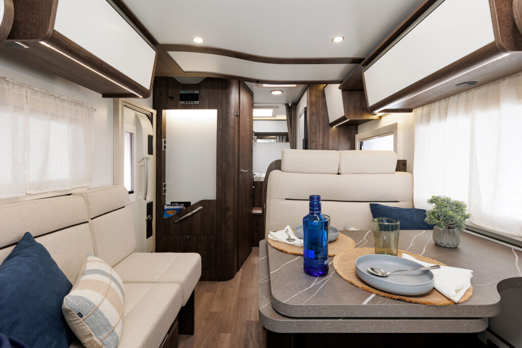 Dos camas dobles una sobre garaje y otra abatible sobre el comedor. Viaja con toda comodidad y disfruta de una zona de estar con asientos cabina giratorios, cocina con la comodidad de un banco en L y no te preocupes del cuarto del ámplio cuarto de baño.