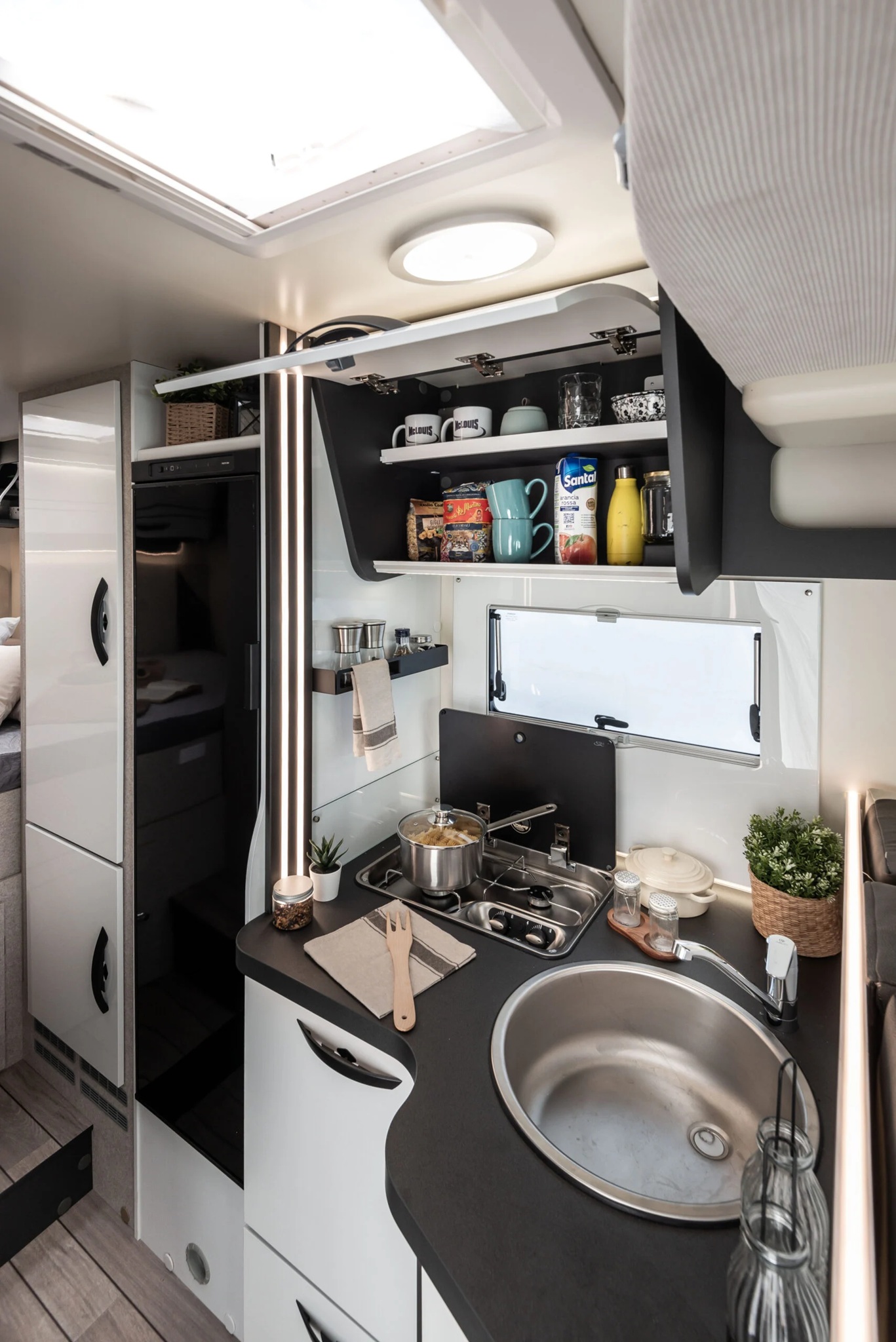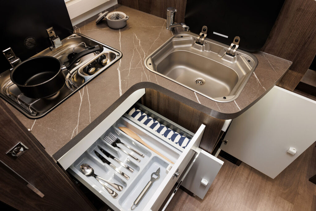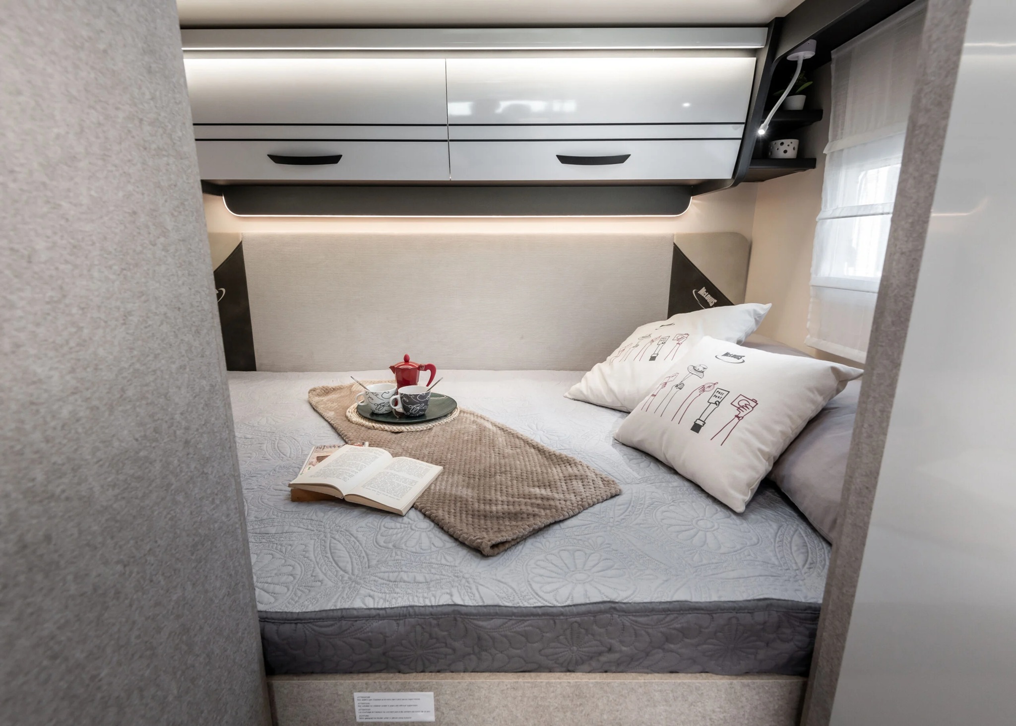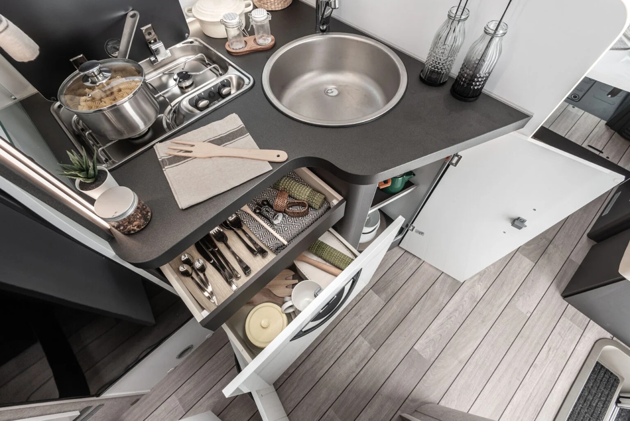 Dos camas dobles una sobre garaje y otra abatible sobre el comedor. Viaja con toda comodidad y disfruta de una zona de estar con asientos cabina giratorios, cocina con la comodidad de un banco en L y no te preocupes del cuarto del ámplio cuarto de baño.