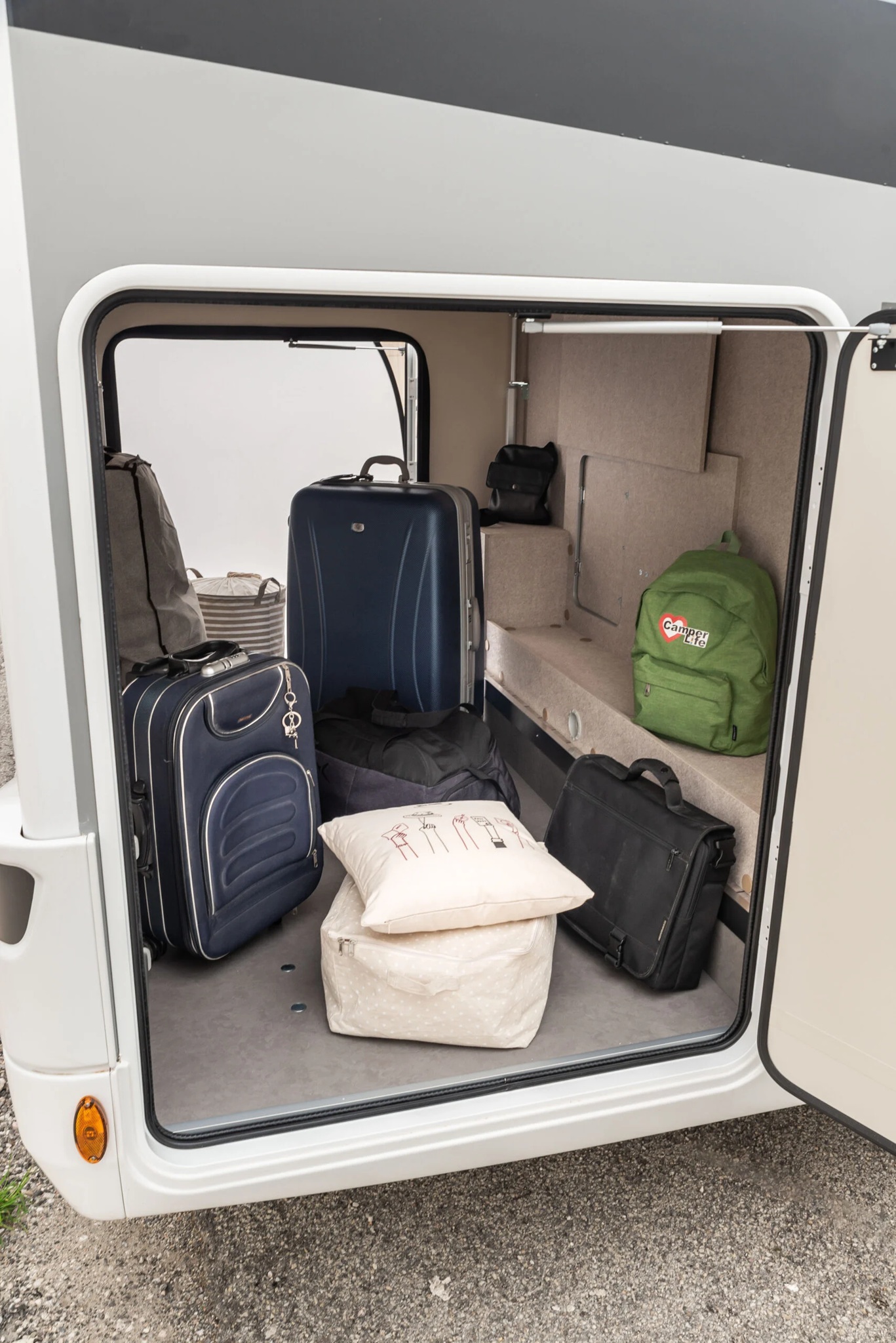 - Kit Viaje (bateria celula, 2 calzos, cable 220v, manguera agua, extintor, chaleco, 2 triangulos, liquido WC)