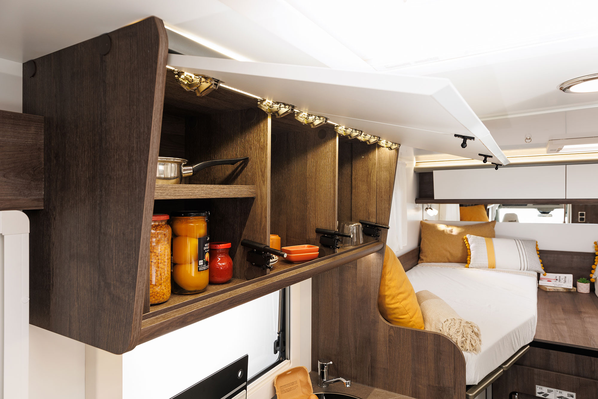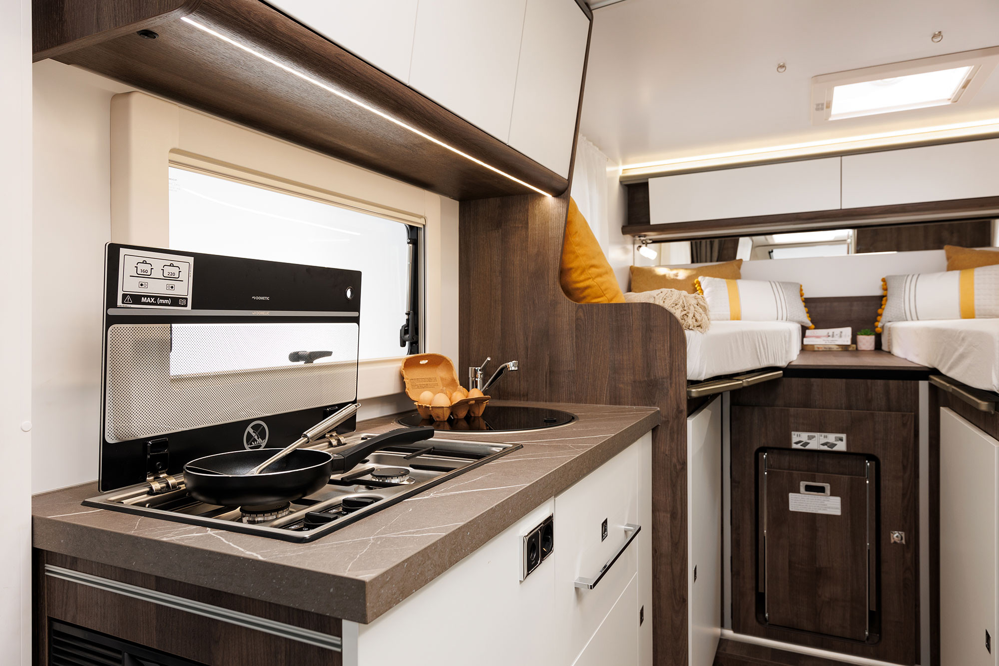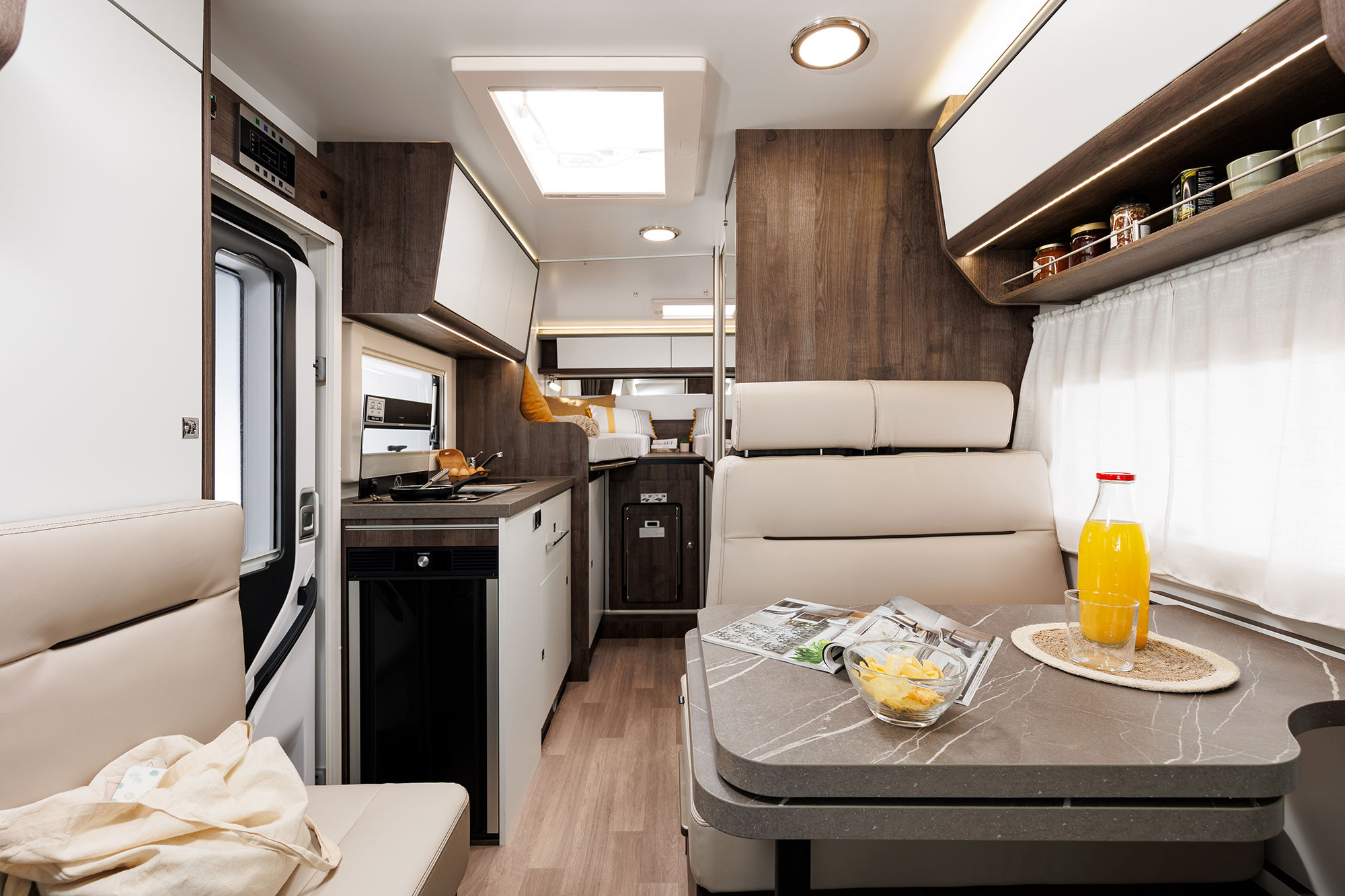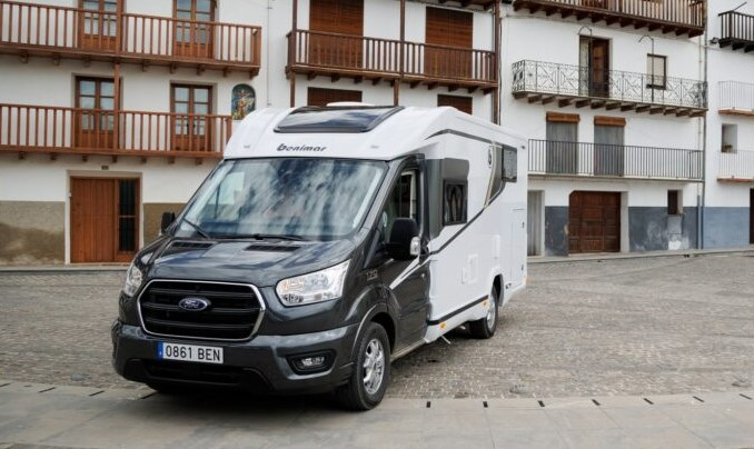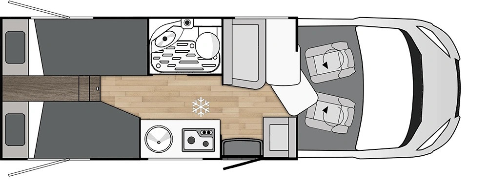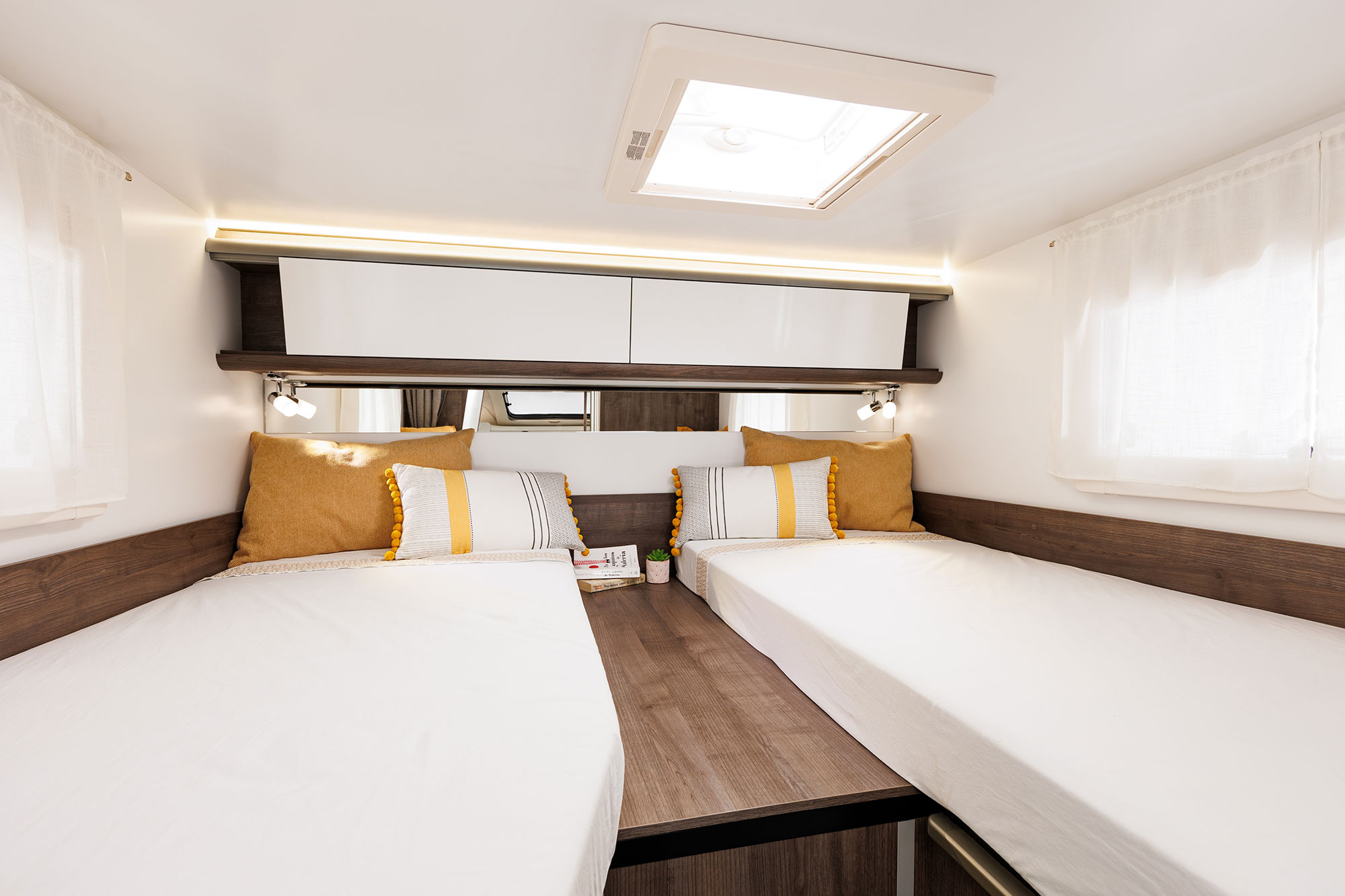 Autocaravana especialmente estrecha con camas gemelas y un amplísimo garaje.