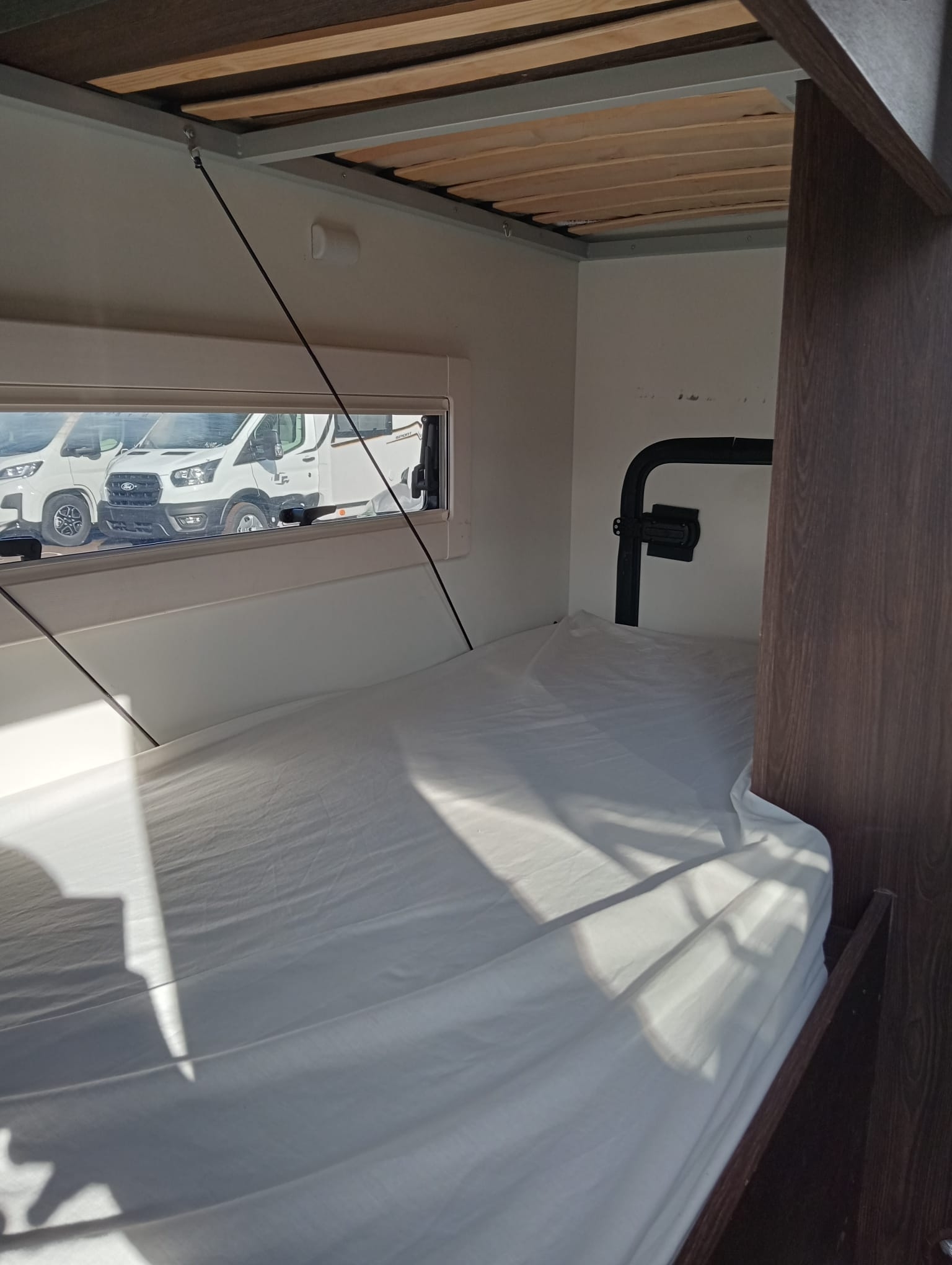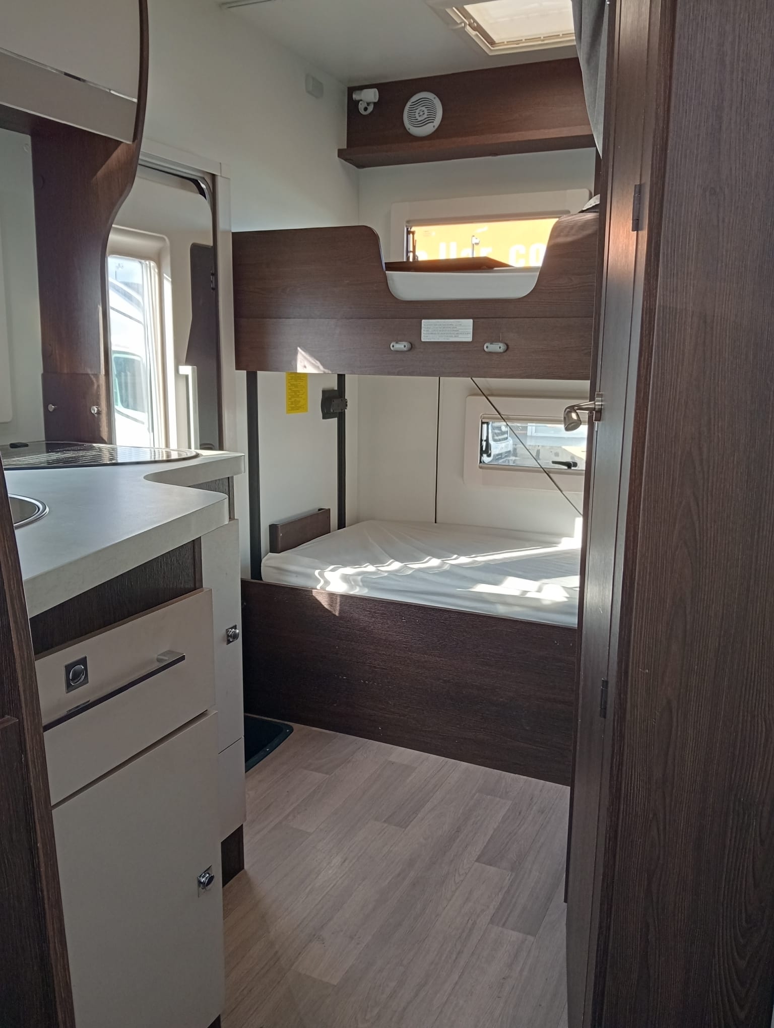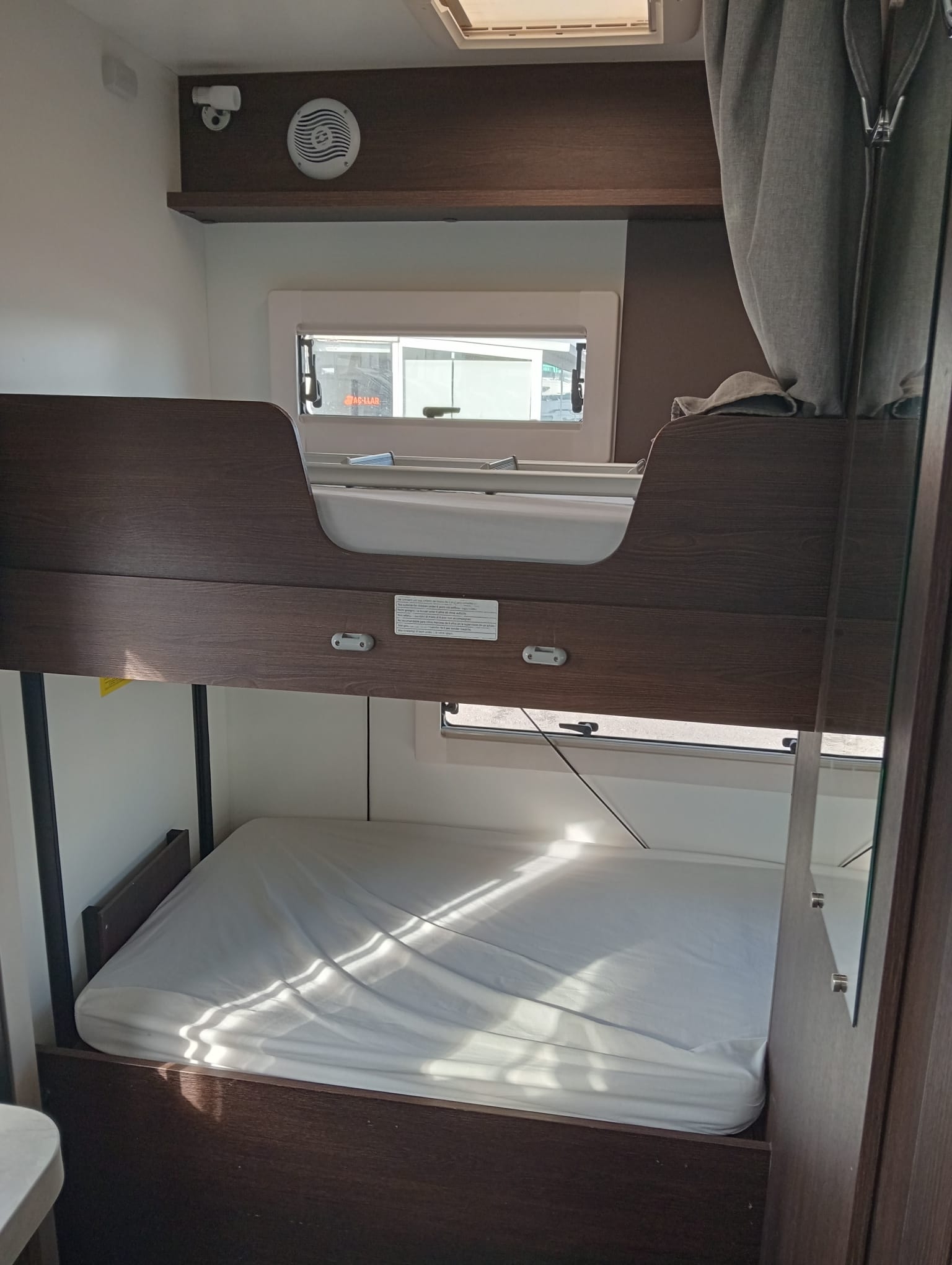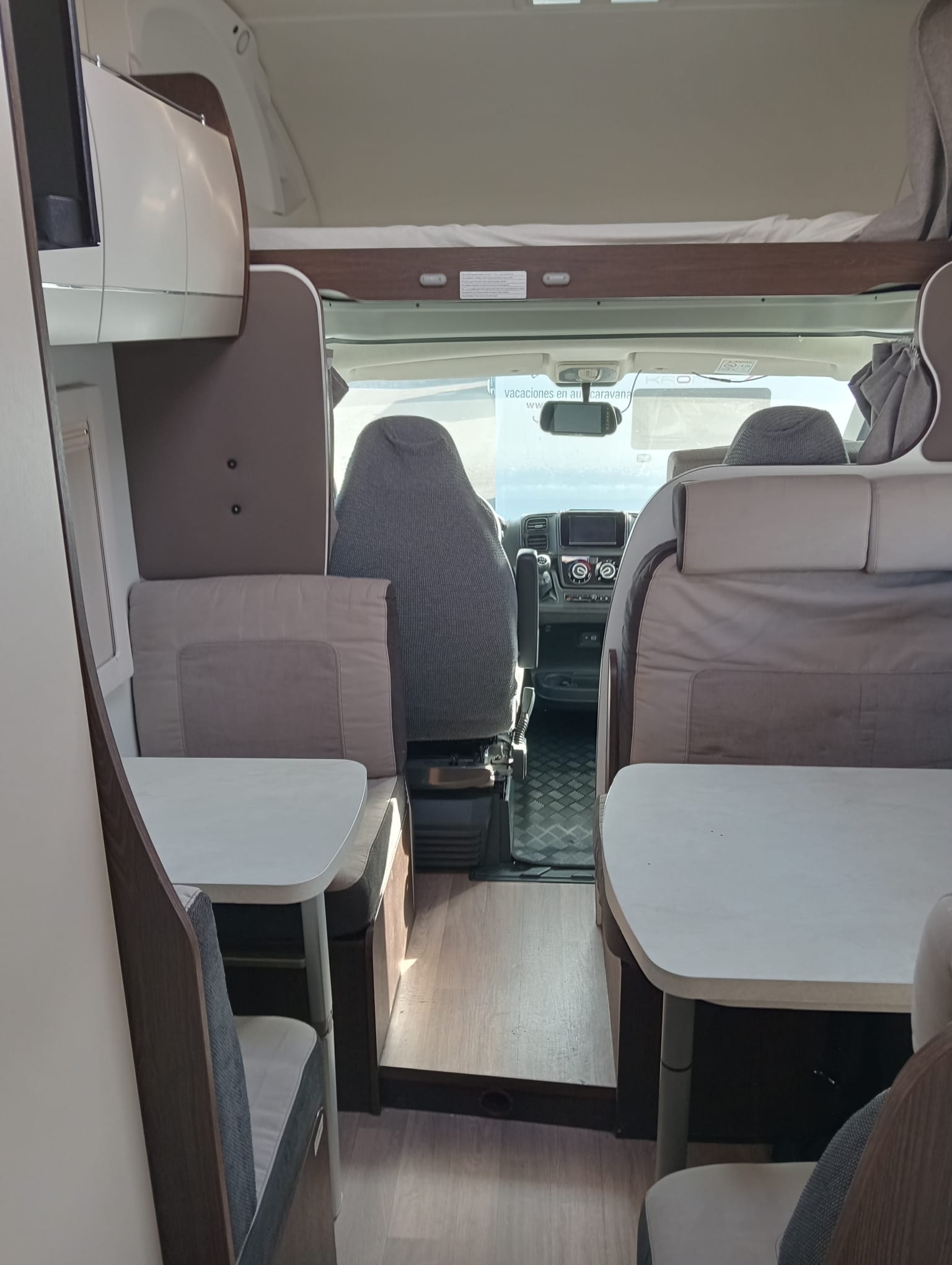 Distribución: Cama sobre cabina, 2 literas individuales, salon transformable en camas.