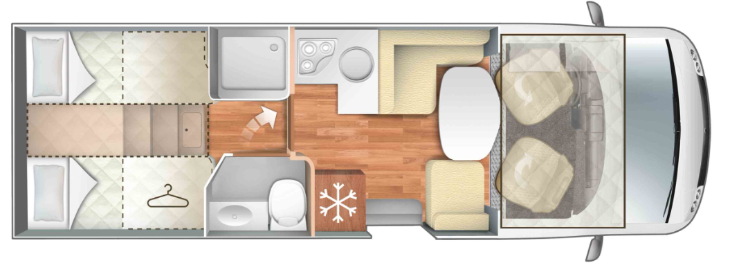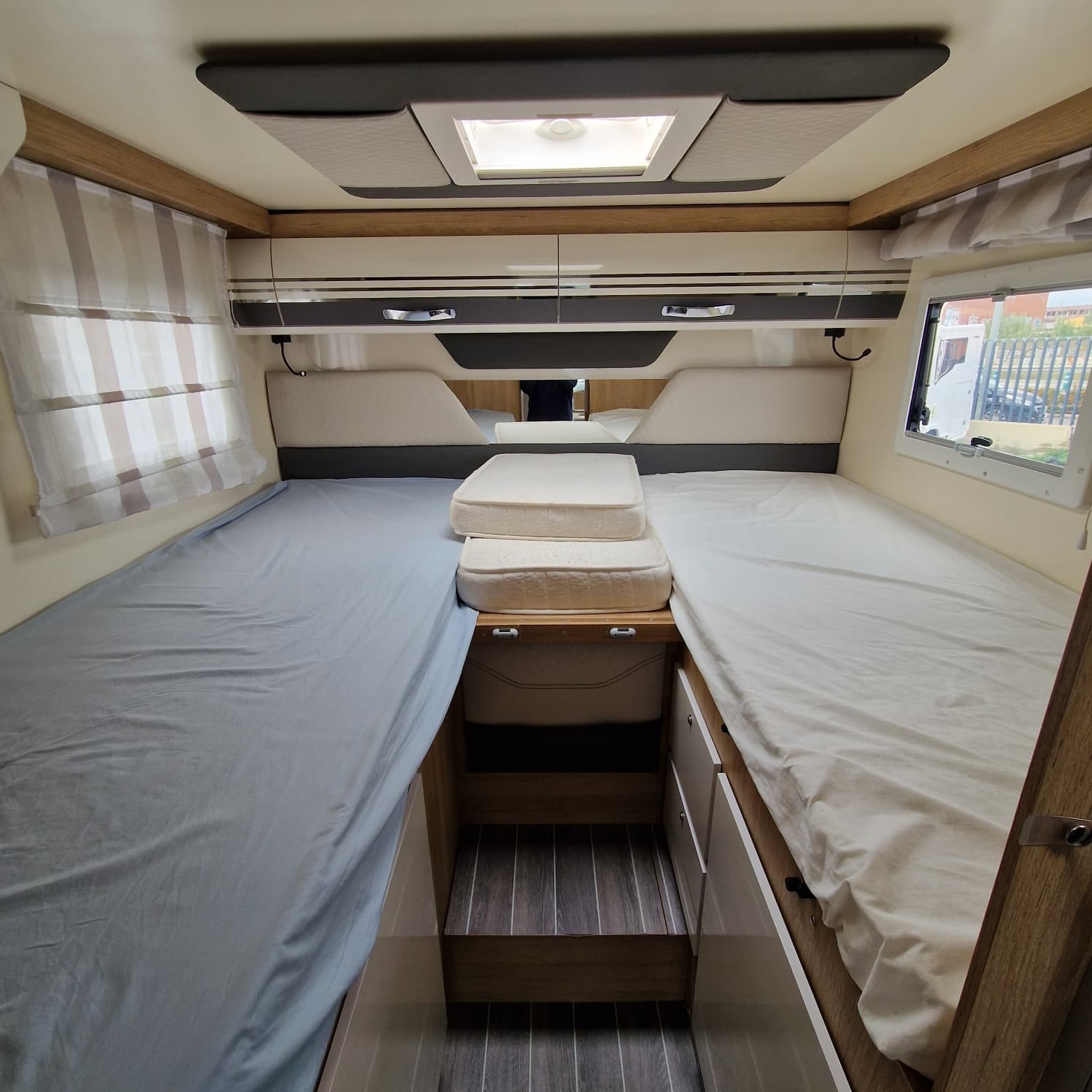 Distribución con camas gemelas traseras, cómodas y de fácil acceso