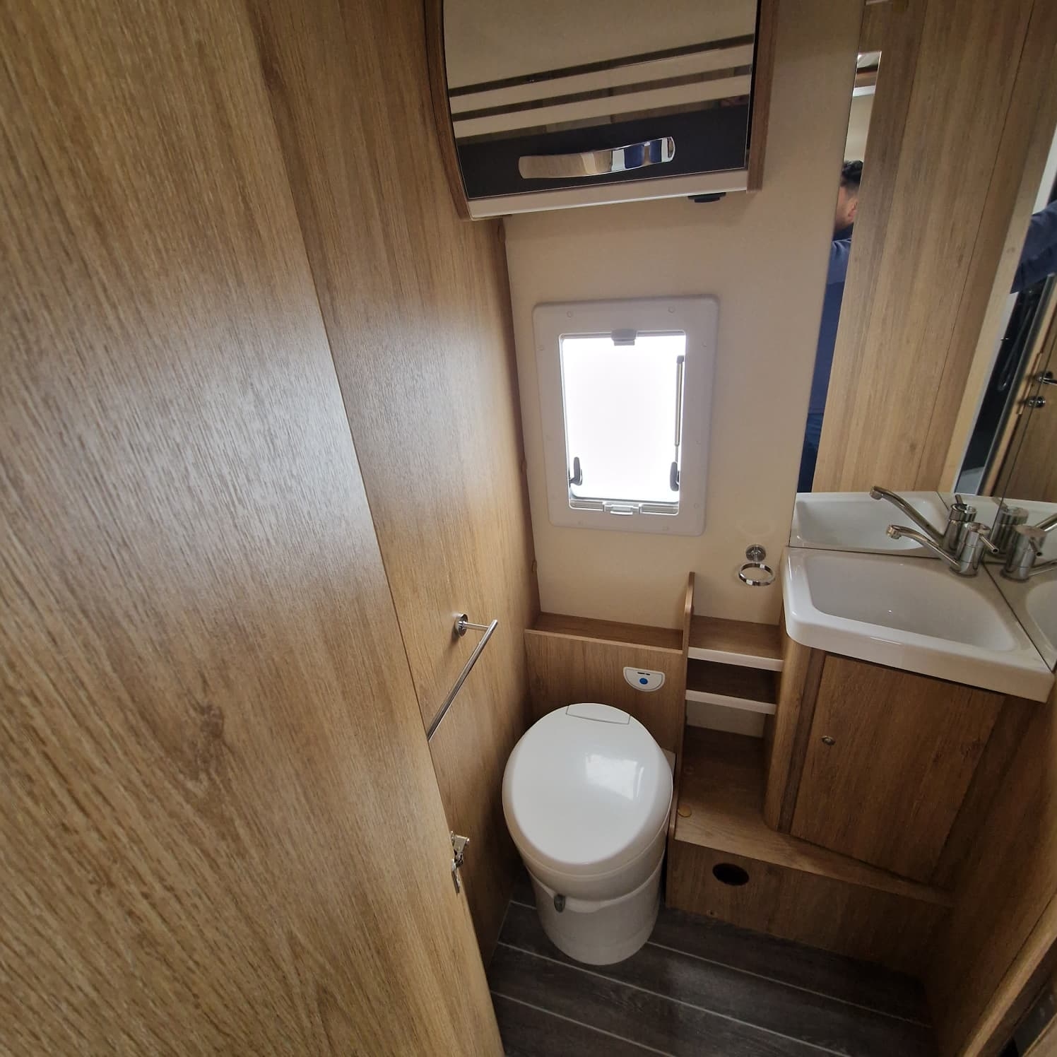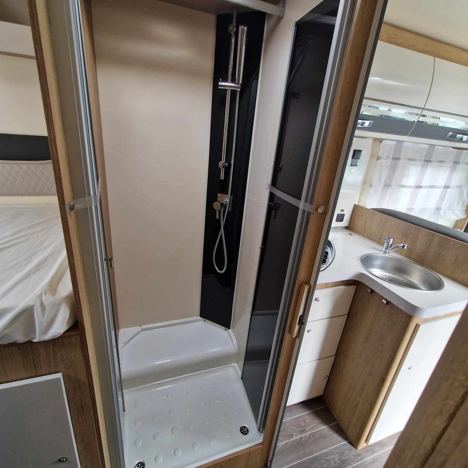 EL BAÑO QUE DESEAS • Muebles de madera • Ducha con mampara rígida, doble desagüe y plataforma de madera (donde esté disponible) • Grandes espejos con iluminación integrada • Ventana y claraboya • El baño sirve como puerta de separación entre las zonas de día y de descanso (según los modelos)