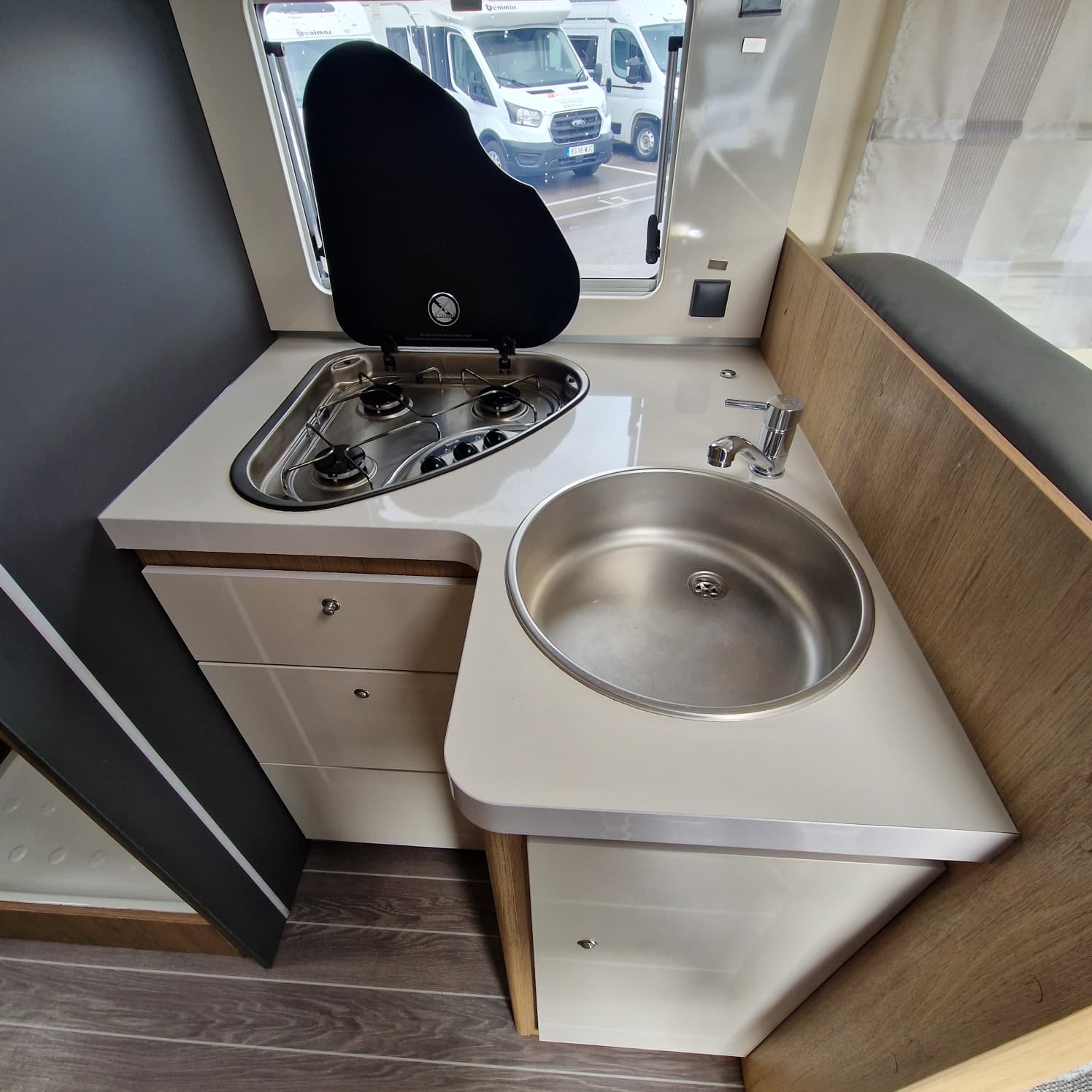 TU COCINA • Módulo de cocina laminado con encimera de acero inoxidable de 3 fogones • Lavabo grande con grifo monomando • Cubreventanas de metacrilato para mayor protección y fácil limpieza • Frigorífico de 2 puertas con congelador y compartimento para botellas de hasta 145 litros