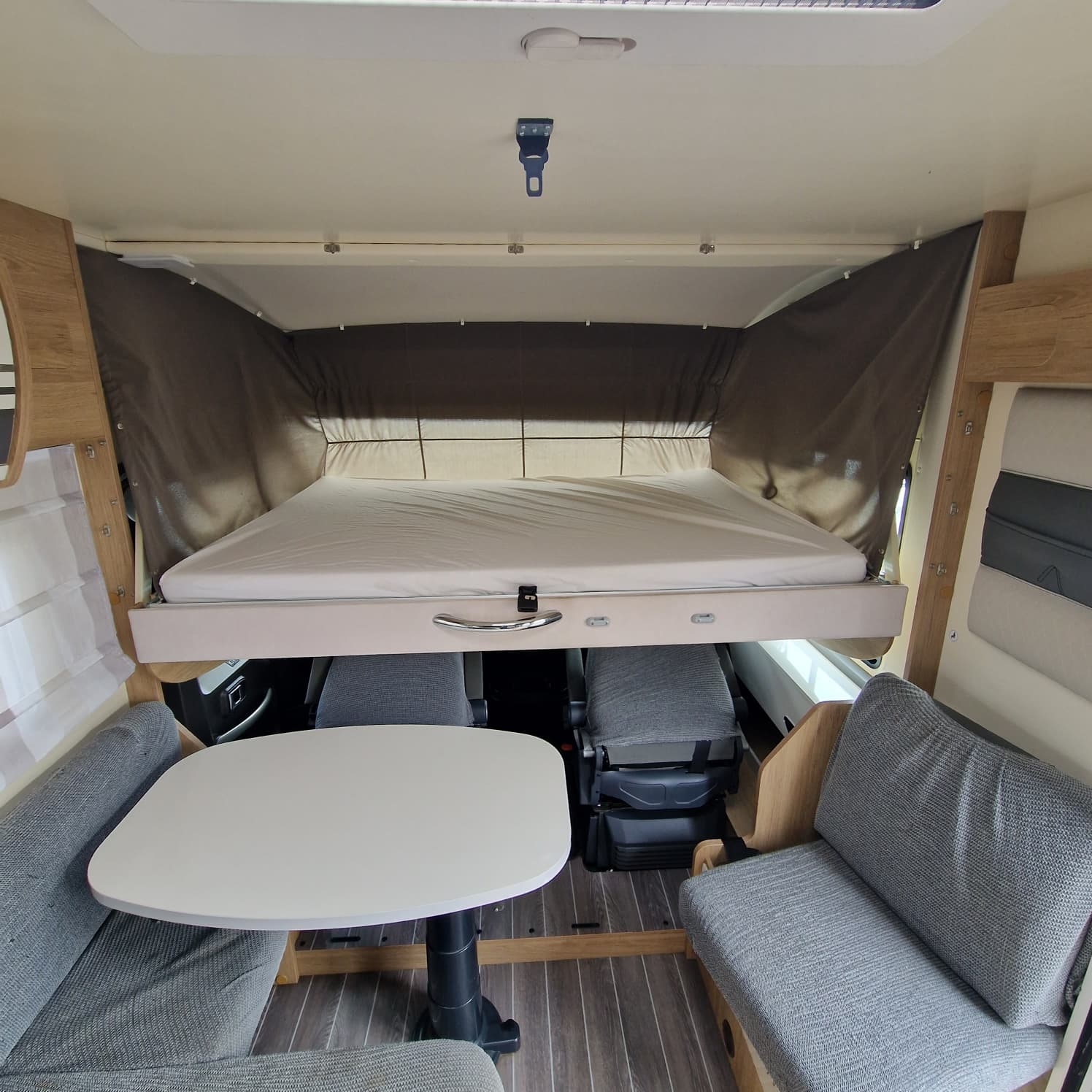 CONFORT DE SUEÑO • Somier de lamas en camas fijas que se pueden levantar para almacenaje • Colchones de tejido transpirable • Luz ambiental de LED • Luces de cortesía en el suelo • Luces de lectura • Maxiventanas con estores • Camas centrales y transversales de volumen variable