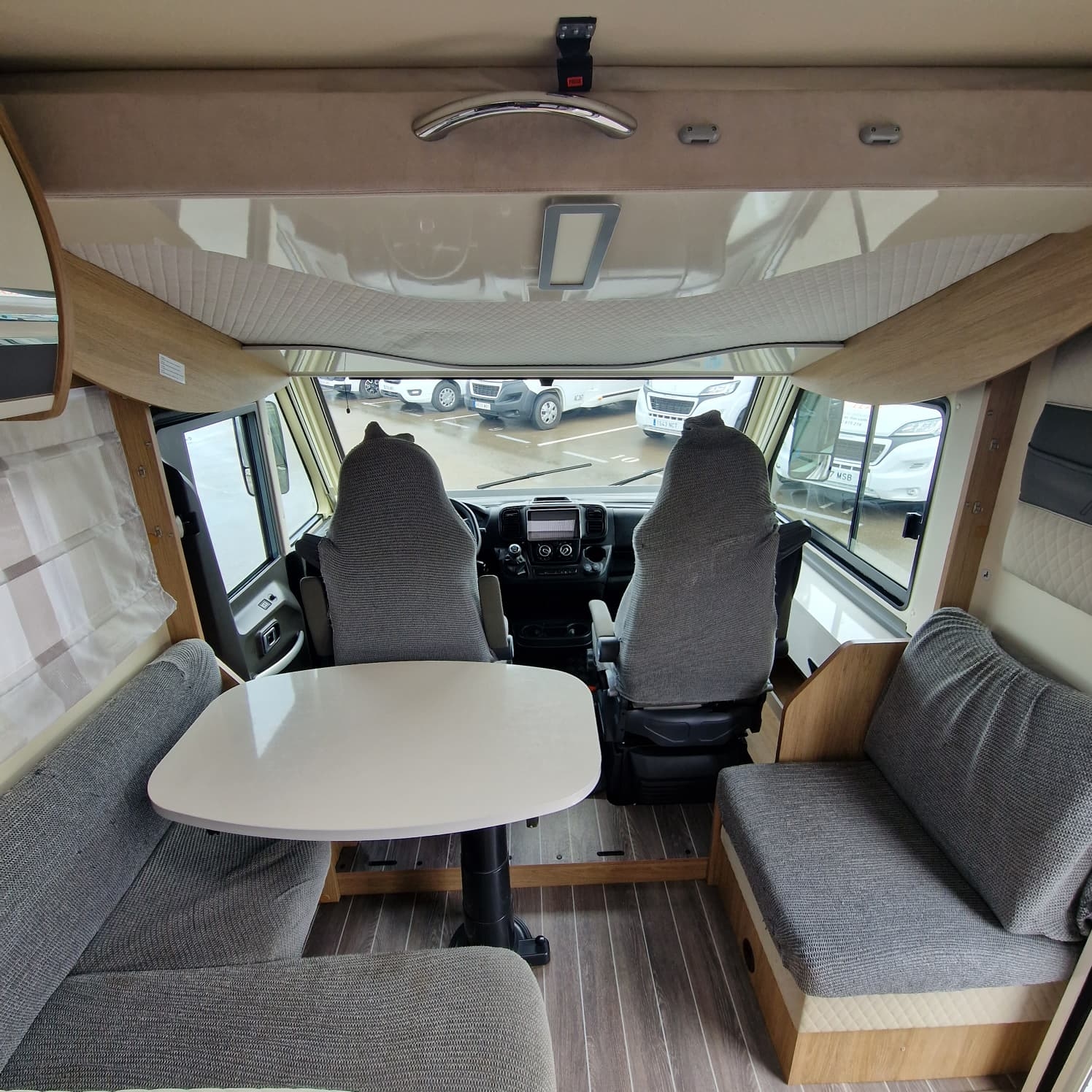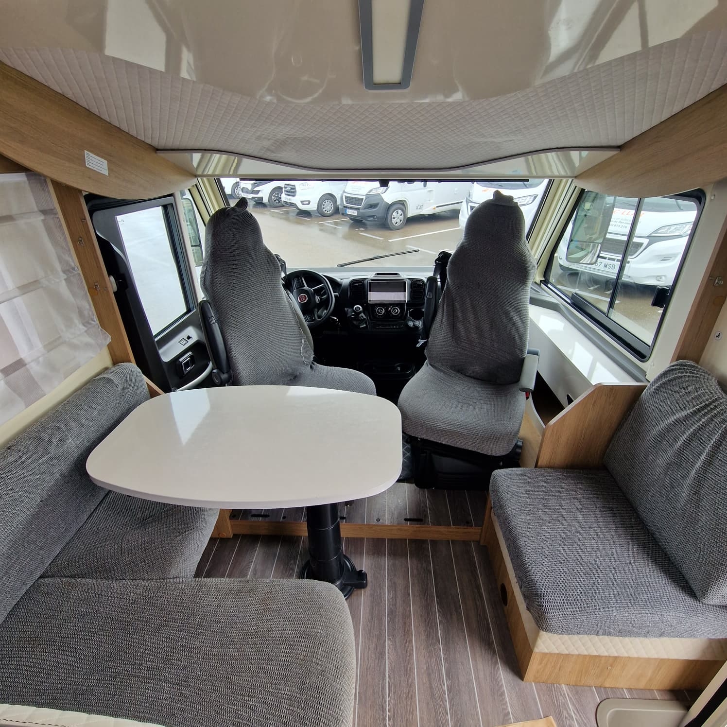 LA ZONA COMEDOR • Luz y aire gracias a las grandes ventanas y al techo panorámico (TL, P) • Tomas USB • Iluminación 100% LED, luces difusas debajo de los armarios • Módulo giratorio de cabina con repisas y compartimentos cerrados y portaobjetos, en modelos integrales y perfilados • Sofás revestidos con acolchado especial en ecopiel para mayor protección